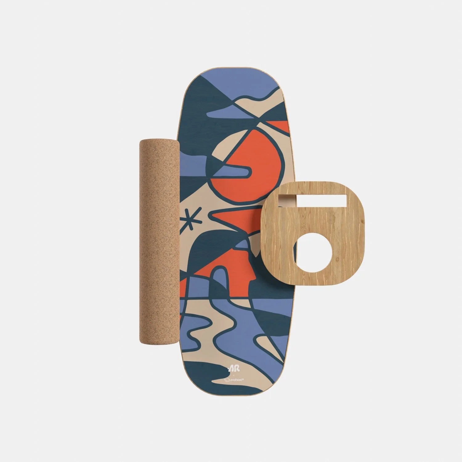 A skateboard with a colorful abstract design, a cork roller, and a wooden skateboard faceplate.