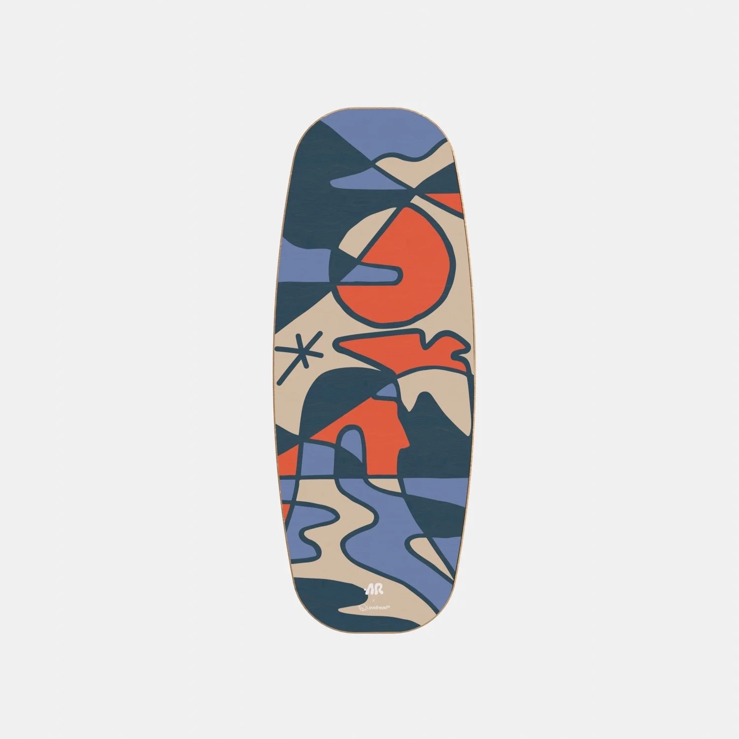 Abstract skateboard deck featuring colorful geometric shapes in shades of blue, orange, beige, and black.